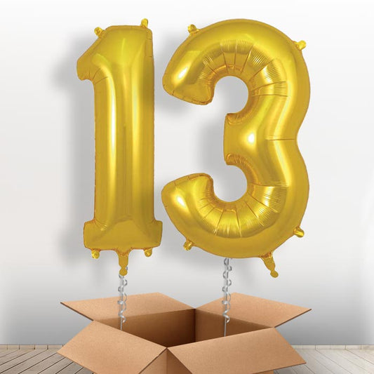 Gold 13 Balloons in a Box: 13th Number Helium Balloons