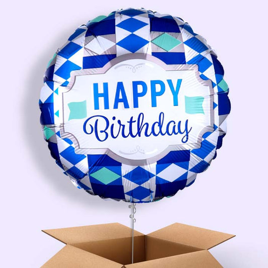 Blue and Gold Geometric Birthday Helium Balloons in a Box
