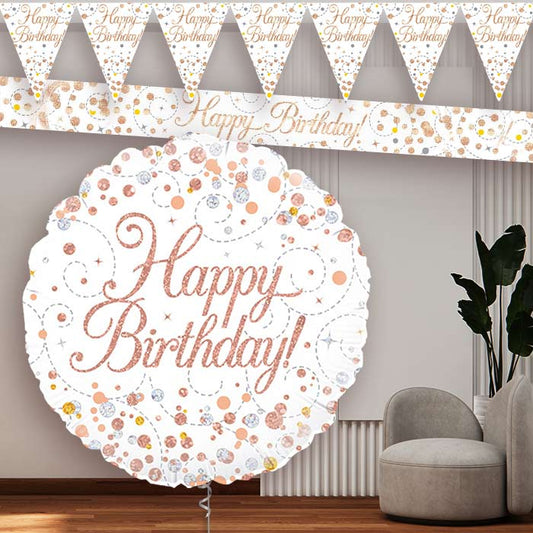 Rose Gold and White Birthday Balloon and Banners