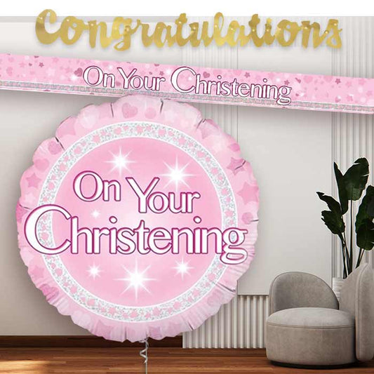 Pink On Your Christening Banners and Balloon