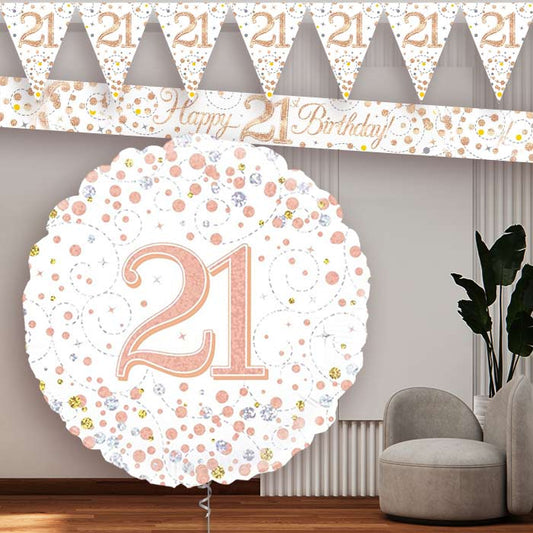 Rose Gold and White 21st Birthday Banners and Balloon