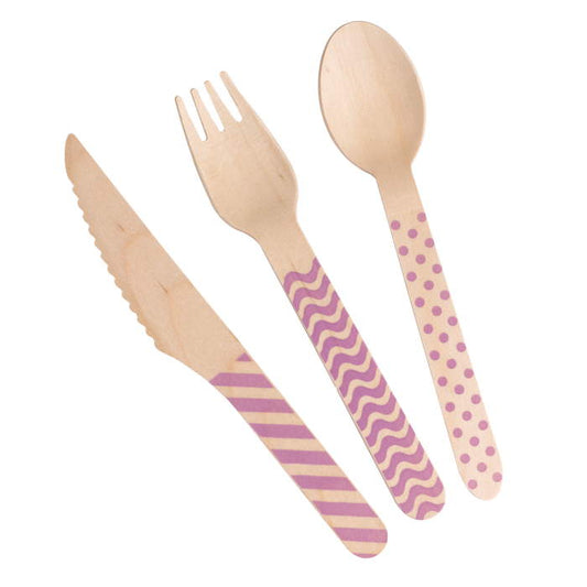 Pink Wooden Cutlery Set Knife Fork and Spoon Pack of 24