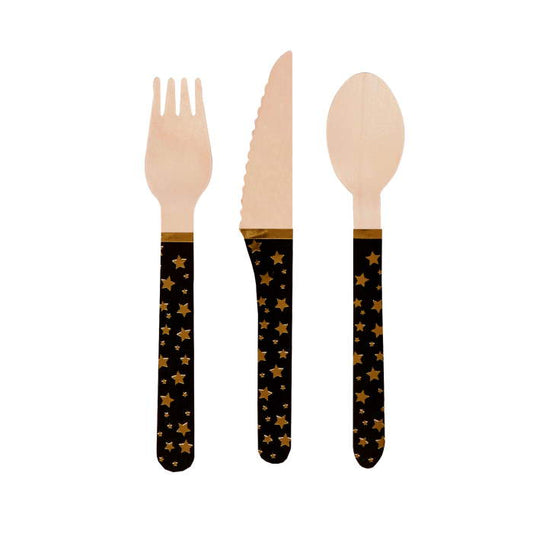 Black and Gold Cutlery - Wooden Pack of 24