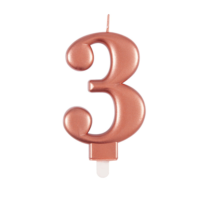 Rose Gold Metallic Number 3 Birthday Cake Candle, perfect for your party cake. Design features Rose Gold Metallic finish.