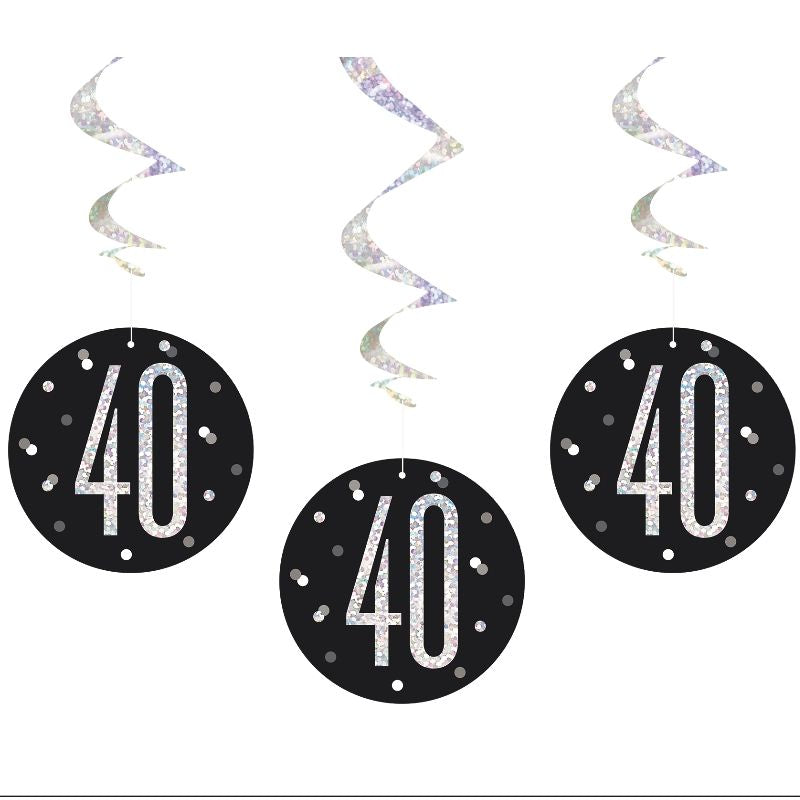 Black Silver 40th Birthday Hanging Decorations Pack of 6