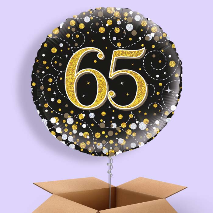 Celebrate their special milestone day with Black and Gold Holographic 65th Birthday Balloons, they make a great gift, table centrepiece and party decoration.