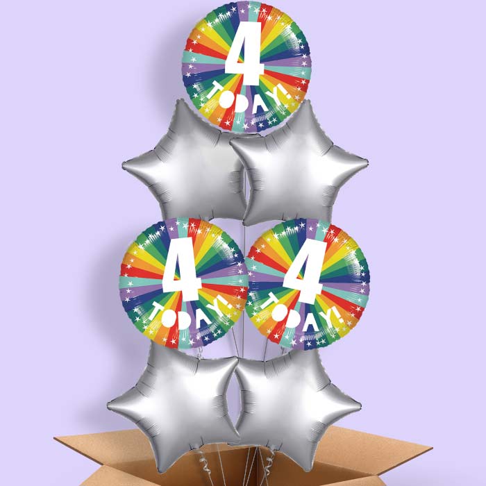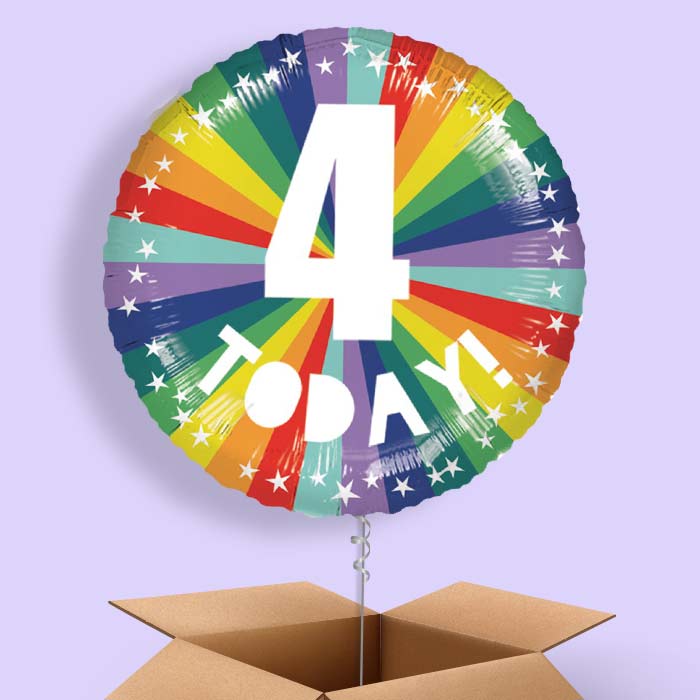 Age 4 4th Birthday Rainbow Foil Balloon in a Box featuring a colourful rainbow 4 Today! design.