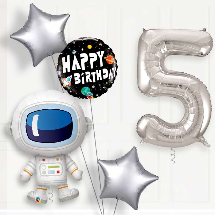 Our Astronaut Helium Balloon Package 5th Birthday will ensure you have all the balloons you need for a special 5th Birthday surprise!