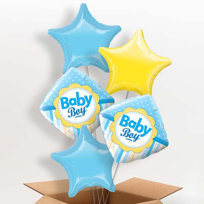 A great Baby Boy Balloon Delivery in a Box (Diamond) surprise featuring "Baby Boy" print on a blue and white backdrop.