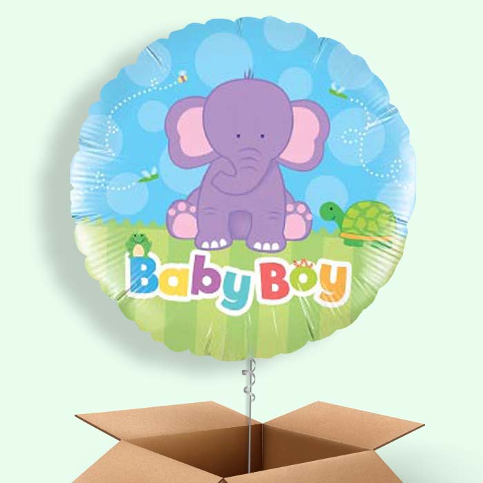 A great Baby Boy Balloons in a Box - Elephant surprise featuring "Baby Boy" print with a purple elephant on a colourful backdrop.