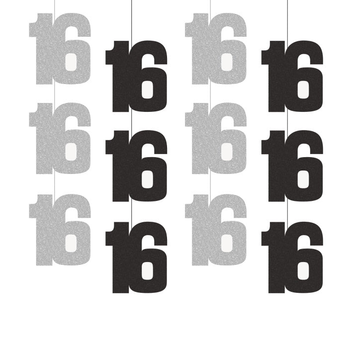 Black & Silver 16th Birthday Hanging String Decorations 6 Pack