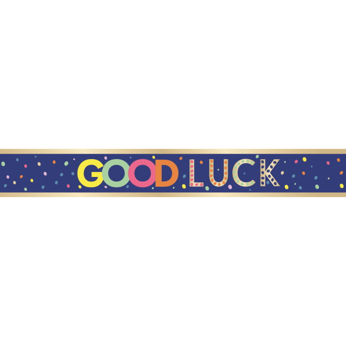 The design features colourful "Good Luck" print on a blue background.