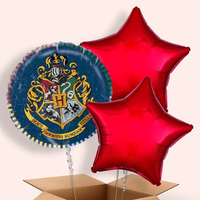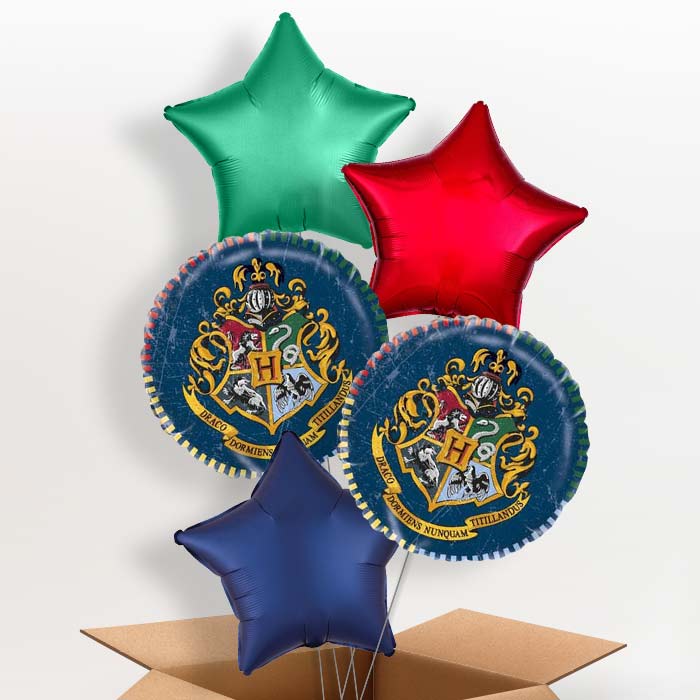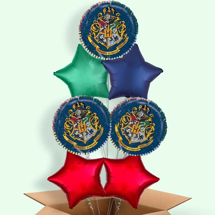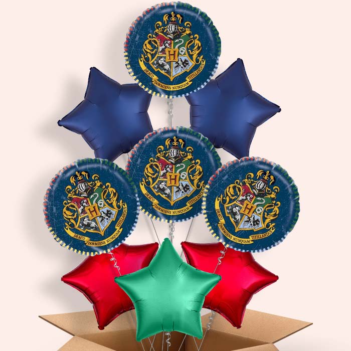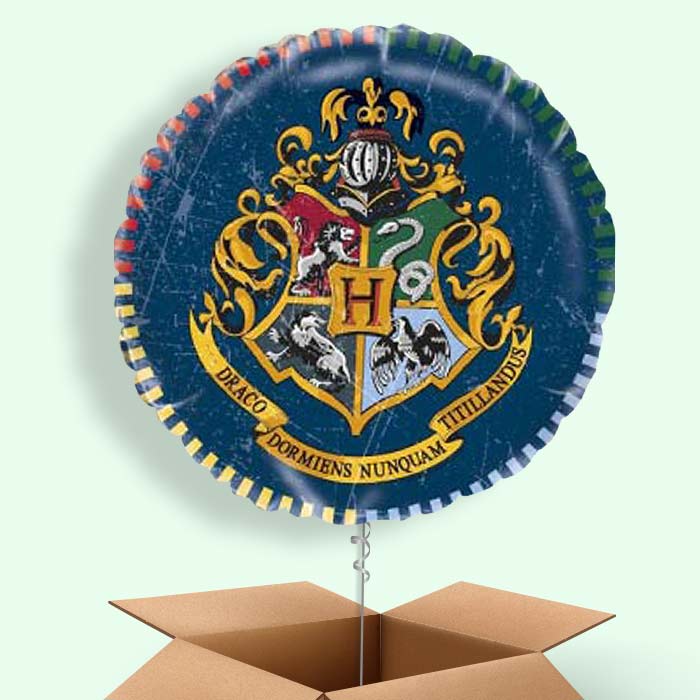A magical Blue Harry Potter Helium Balloons Delivered surprise featuring a blue backdrop with the Harry Potter shield.