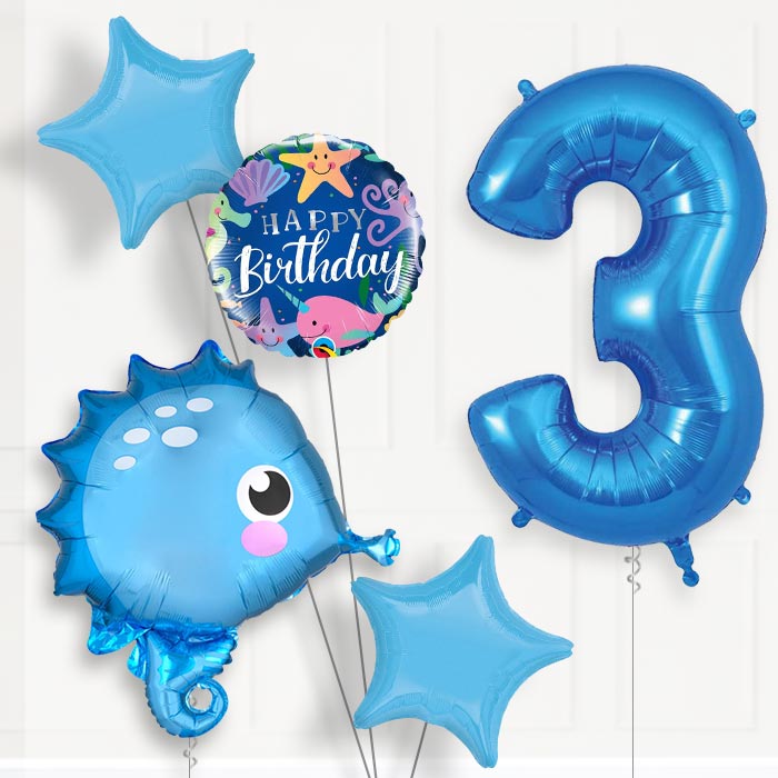 Our Blue Seahorse Helium Balloon Package 3rd Birthday will ensure you have all the balloons you need for a special 3rd Birthday surprise!