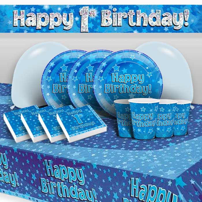 Blue Star Happy 1st Birthday Premium Party Pack Tableware and Decoration Bundle. Design features Blue Star Happy 1st Birthday print.