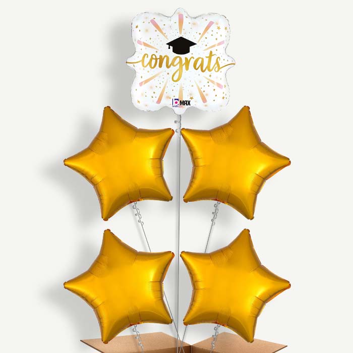 Celebrate in full swing with Caps Graduation Balloon Cluster Inflated with Helium. This balloon cluster has a featured design balloon on top with 4 plain coloured balloons underneath.