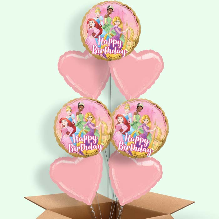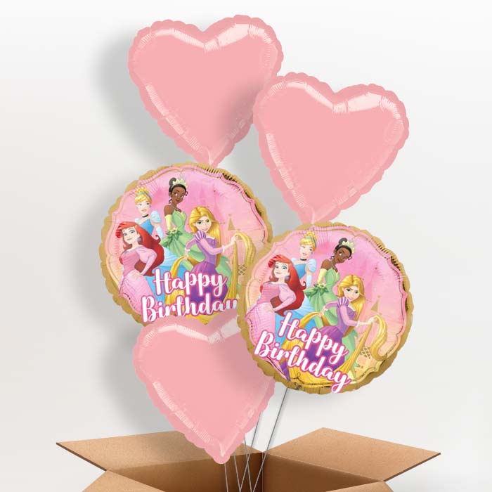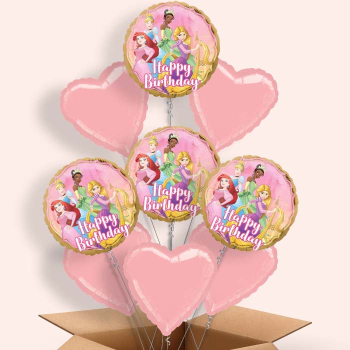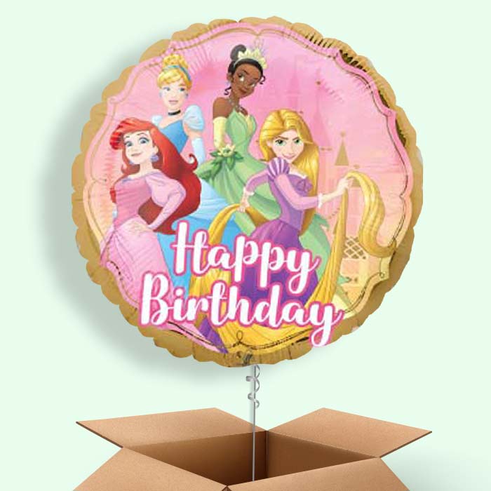 A Disney Princess Birthday Balloon in a Box surprise featuring a lovely Disney Princess design featuring Belle, Ariel and Rapunzel.