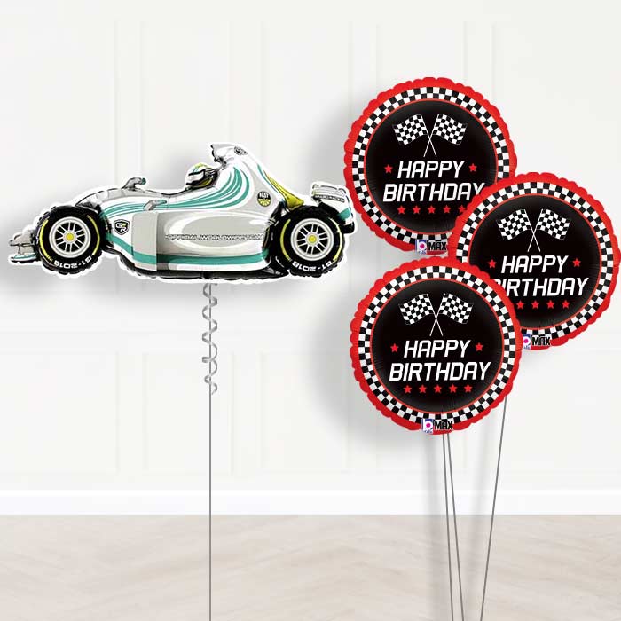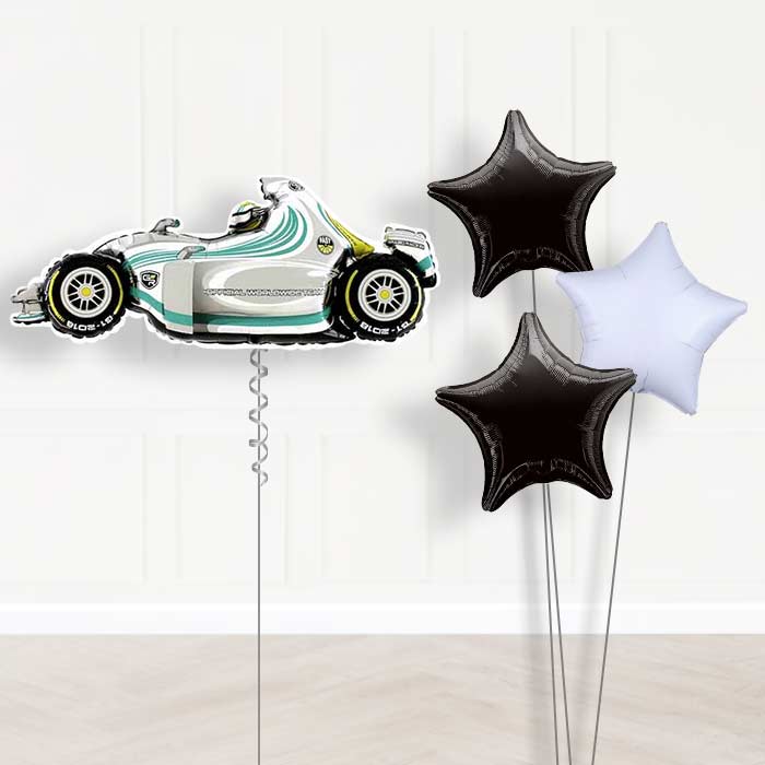 Our balloon bouquet can have personalised text added to it and the main balloon features a giant grey racing design.