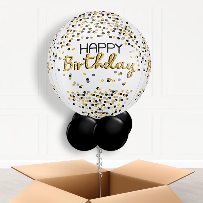 A Gold and Black Birthday Orbz Balloon in a Box surprise.