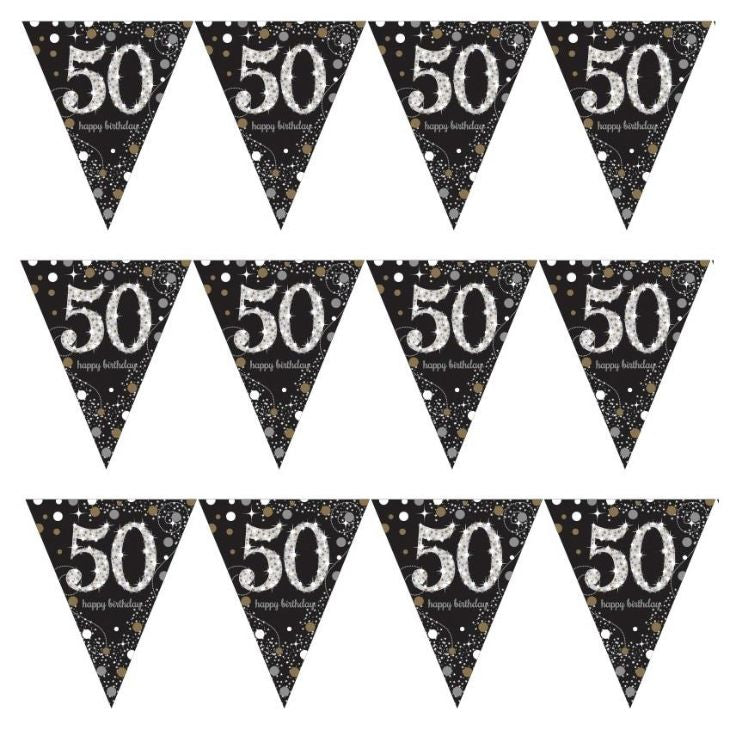 Gold Sparkle Happy 50th Birthday Foil Flag Bunting Banner Party Decoration. Design features Gold Sparkle Happy 50th Birthday print.