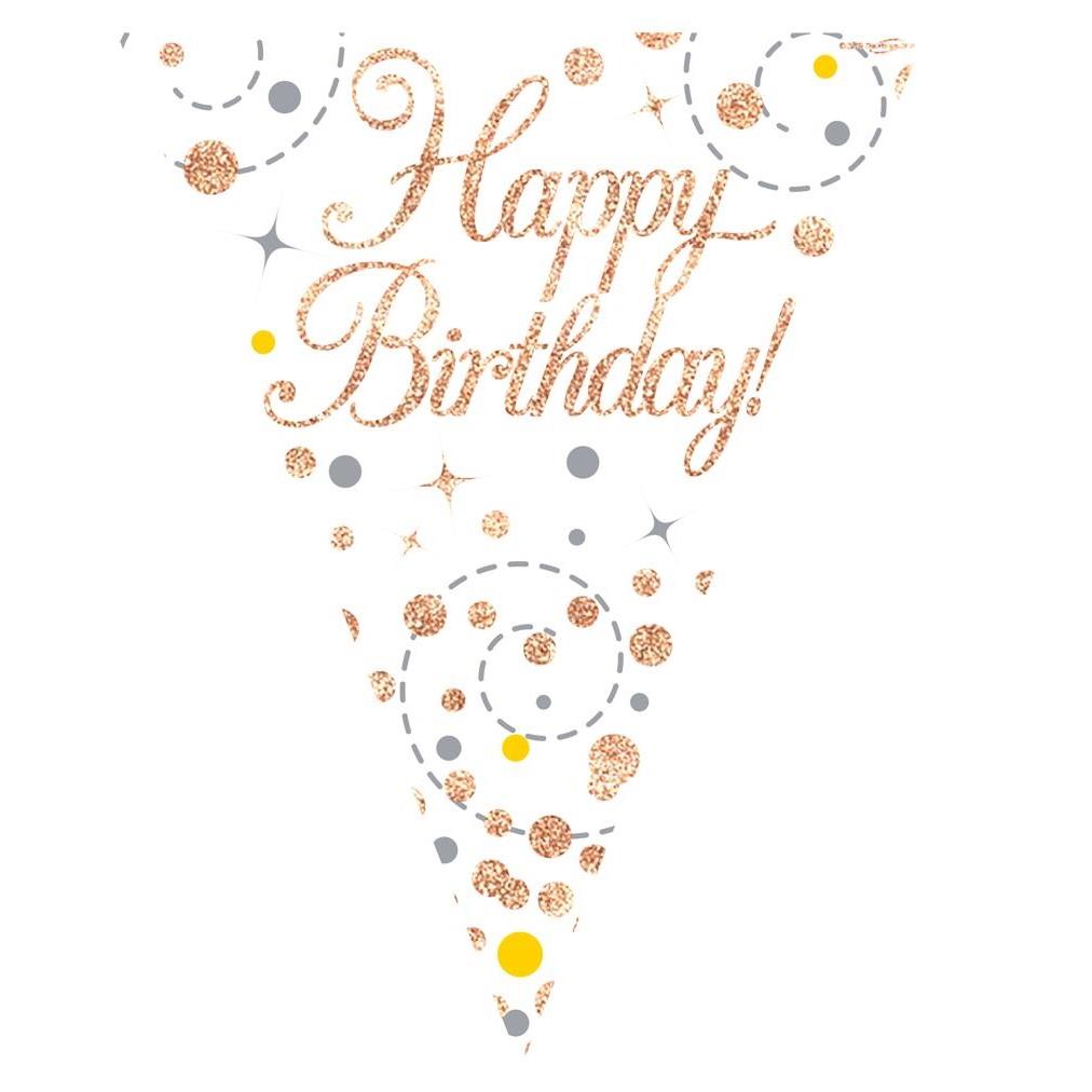 The elegant design features a white background with "Happy Birthday!" print in a metallic effect rose gold colour with dots and swirls in rose gold, silver and gold tones on triangle flags.
