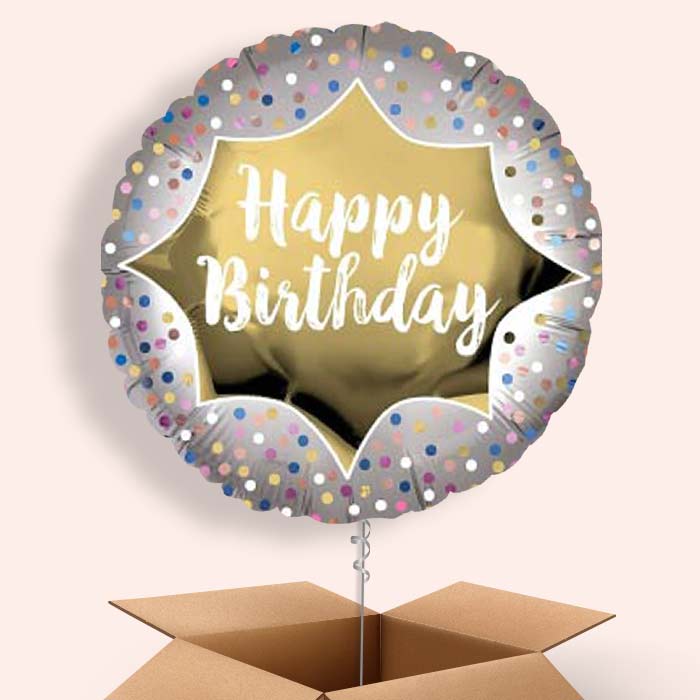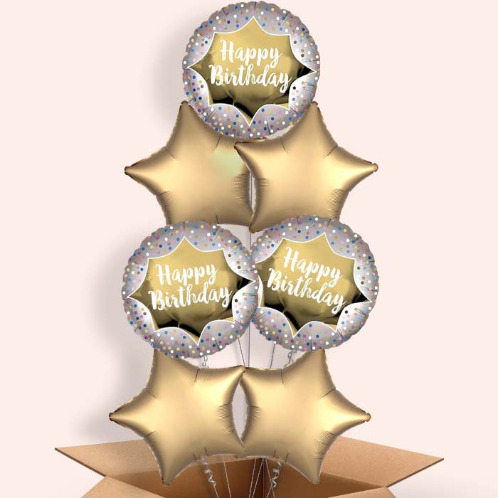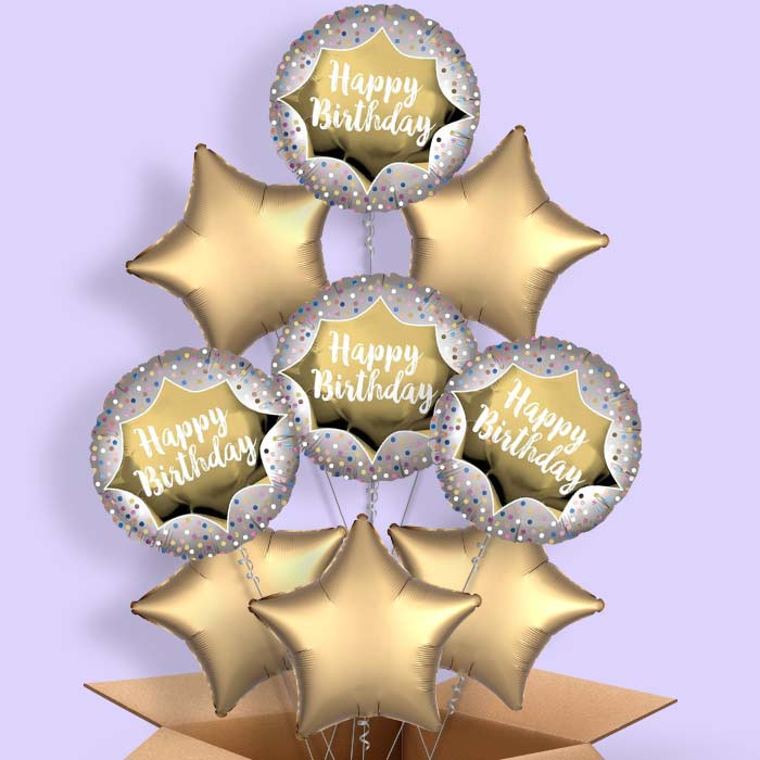 Happy Birthday Gold Balloons in a Box surprise featuring gold confetti style print with Happy Birthday text.