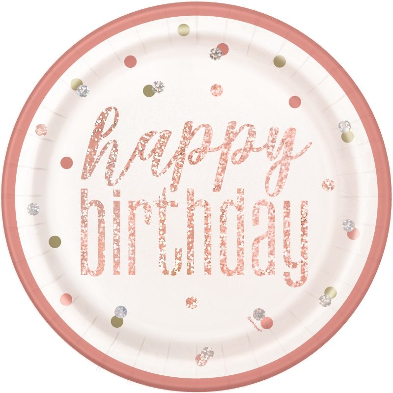 The lovely design features a white background with rose gold "Happy Birthday" holographic print with dots in gold, silver and rose gold tones. The edge of the plate is rose gold in colour.