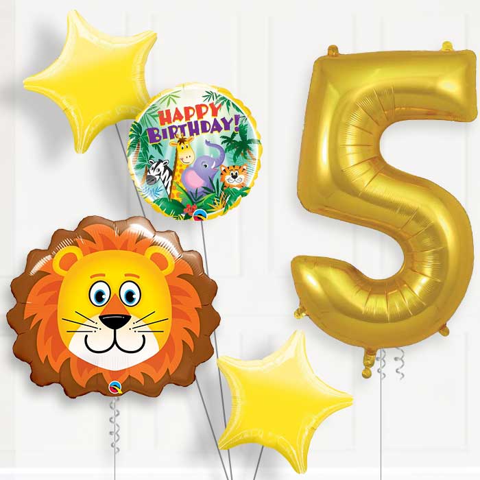 Our Lion Helium Balloon Package 5th Birthday will ensure you have all the balloons you need for a special 5th Birthday surprise!