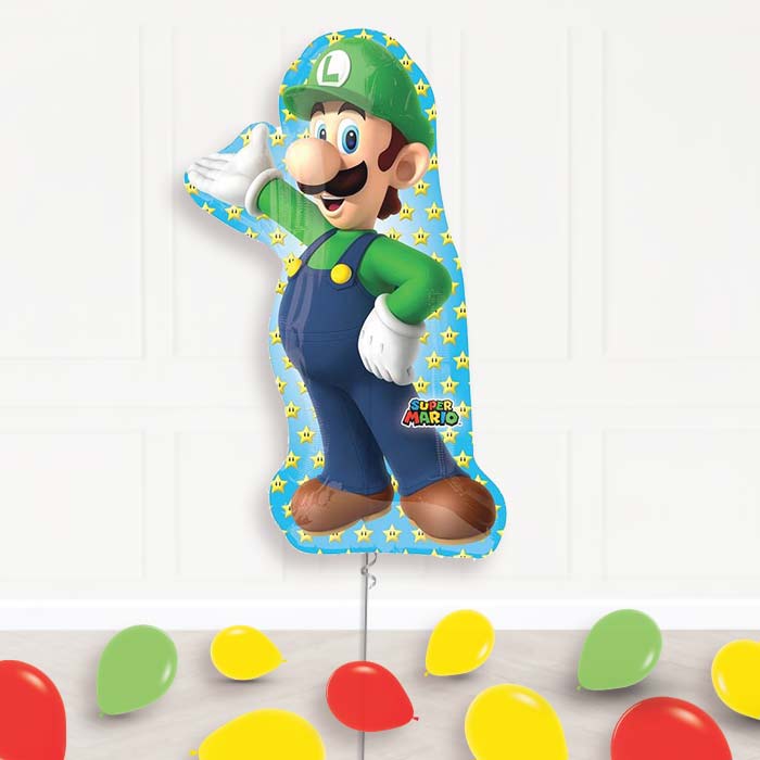 Our balloon display is loaded with a Luigi balloon, Super mario themed foil balloons and some small balloons to scatter across the floor for maximum impact!