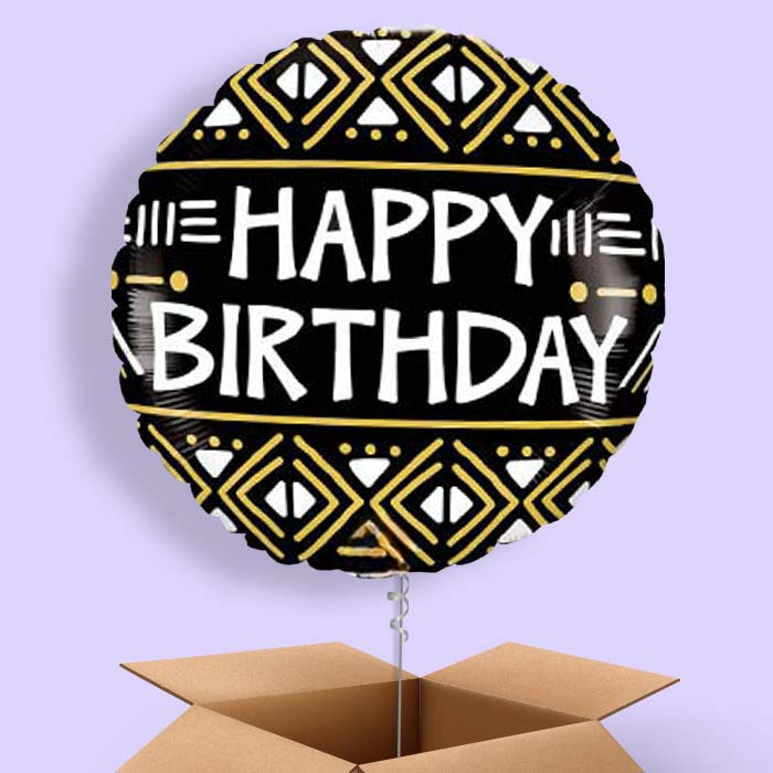 Mud Cloth Print Happy Birthday Foil Helium Balloon in a Box Gift.