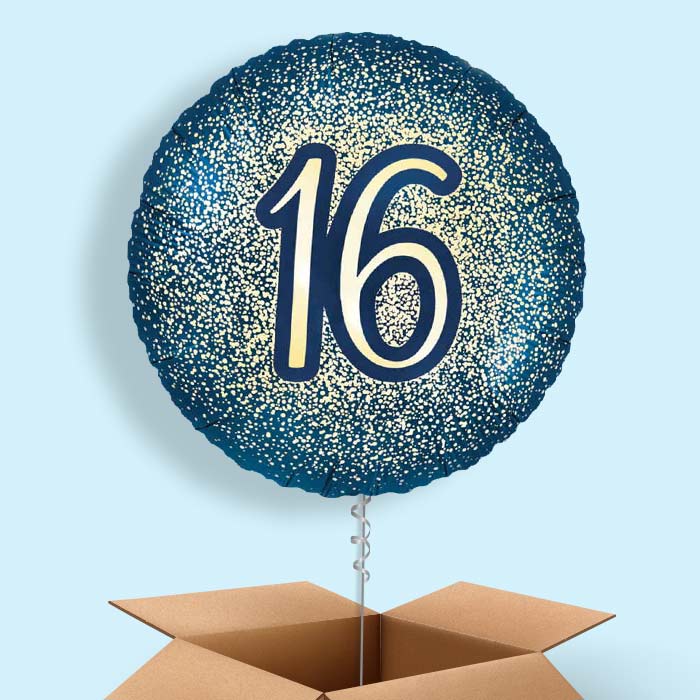 Navy and Gold 16th Birthday Foil Balloon in a Box featuring a navy blue and gold 16 number design.