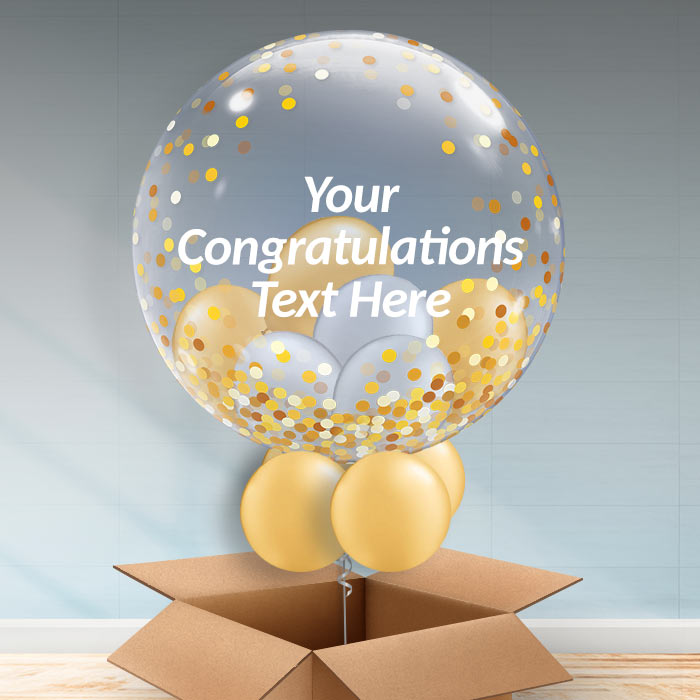 An elegant Personalisable Congratulations Bubble Balloon that is fully transparent with gold confetti print print and has gold balloons inside.