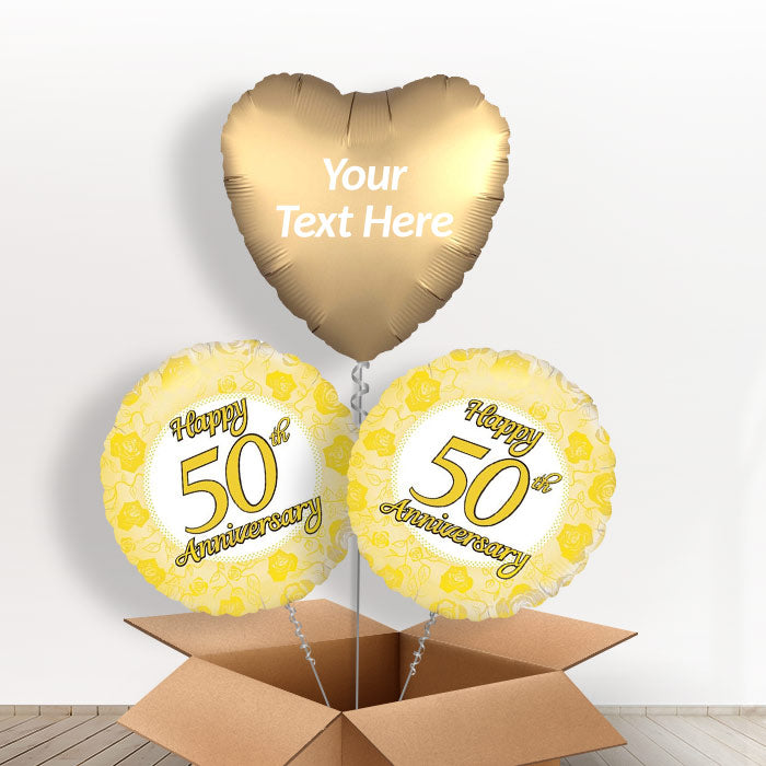 Personalisable Inflated Happy 50th Anniversary Gold 3 Balloon Bouquet in a Box Gift.