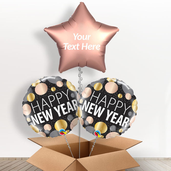 Personalisable Inflated Happy New Year Metallic Dots 3 Balloon Bouquet in a Box Gift.