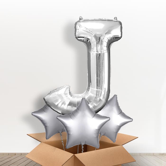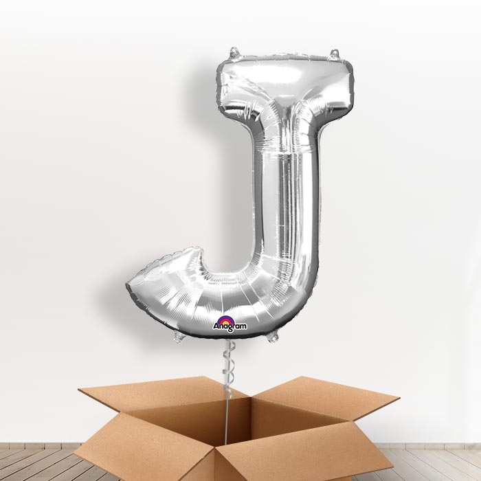 Personalisable Silver Giant Letter J Balloon in a Box Gift.