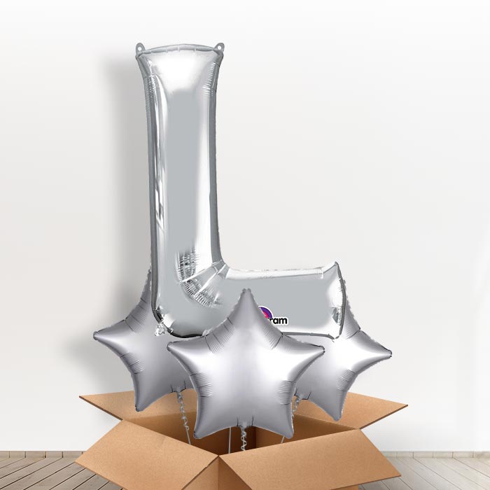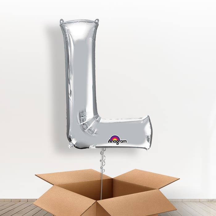 Personalisable Silver Giant Letter L Balloon in a Box Gift.