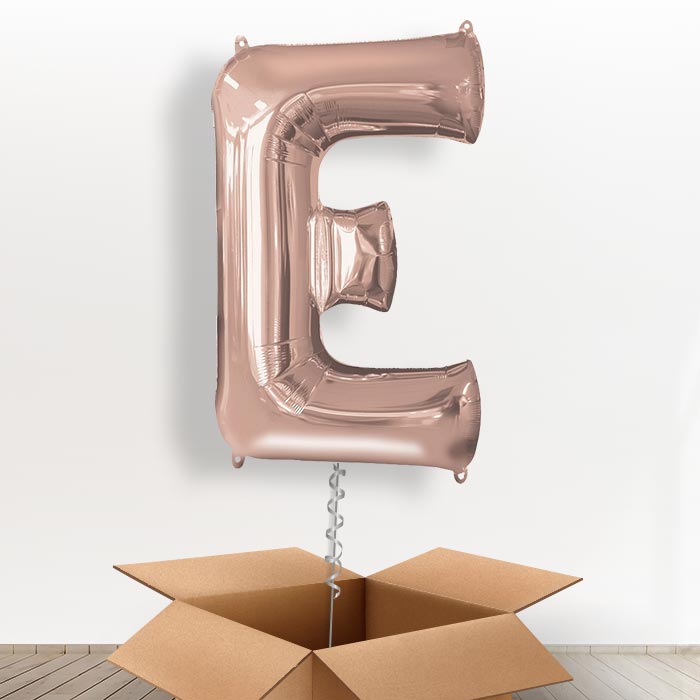 Personalisable Rose Gold Giant Letter E Balloon in a Box Gift.