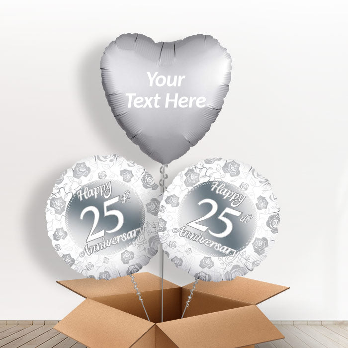 Personalisable Inflated Happy 25th Anniversary Silver 3 Balloon Bouquet in a Box Gift.