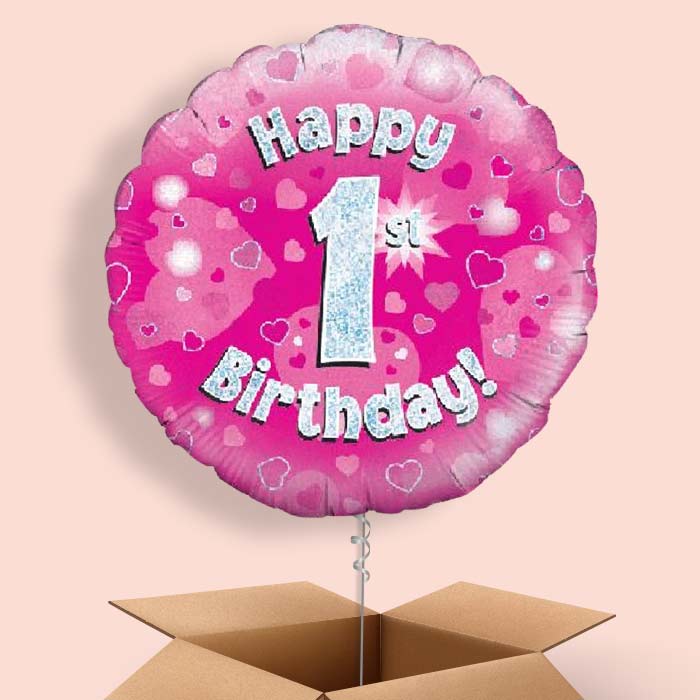 A lovely Pink Heart 1st Birthday Helium Balloons Delivered birthday surprise featuring a pink heart design with "Happy 1st Birthday!" text.
