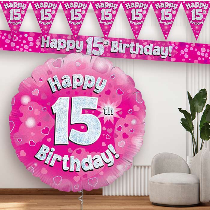 Celebrate a 15th Birthday in style with Pink Hearts 15th Birthday Balloon and Banners.