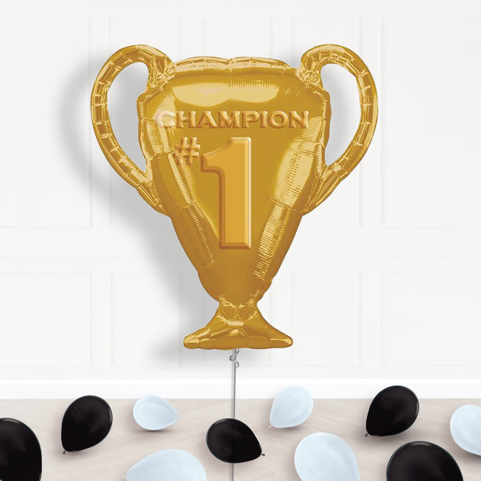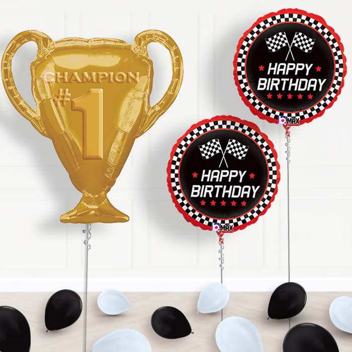 Our balloon display is loaded with a Trophy balloon, racing themed foil balloons and some small balloons to scatter across the floor for maximum impact!