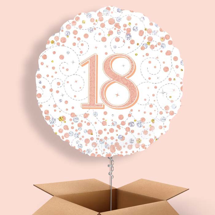 A lovely Rose Gold 18th Birthday Balloons Delivered in a Box surprise featuring a rose gold confetti style print with "18" upon them.
