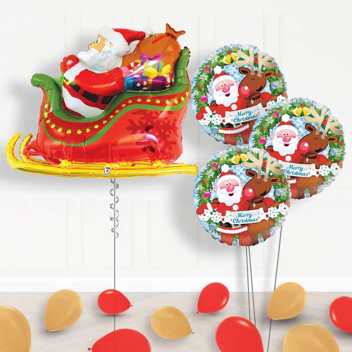 A great Santa Sleigh Christmas Helium Balloon Bouquet Delivered, a magical Christmas surprise gift and an epic party decoration in one!