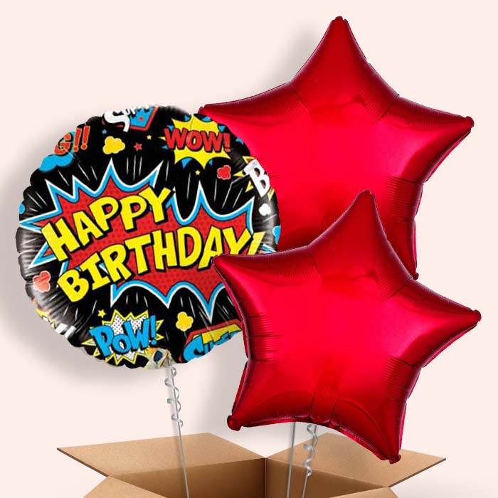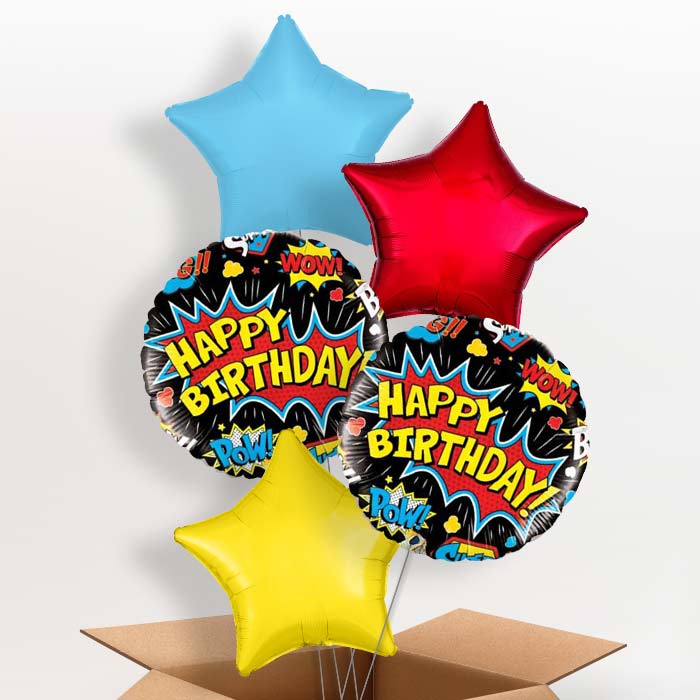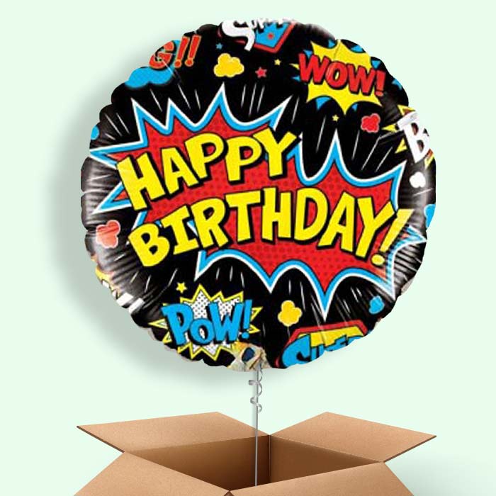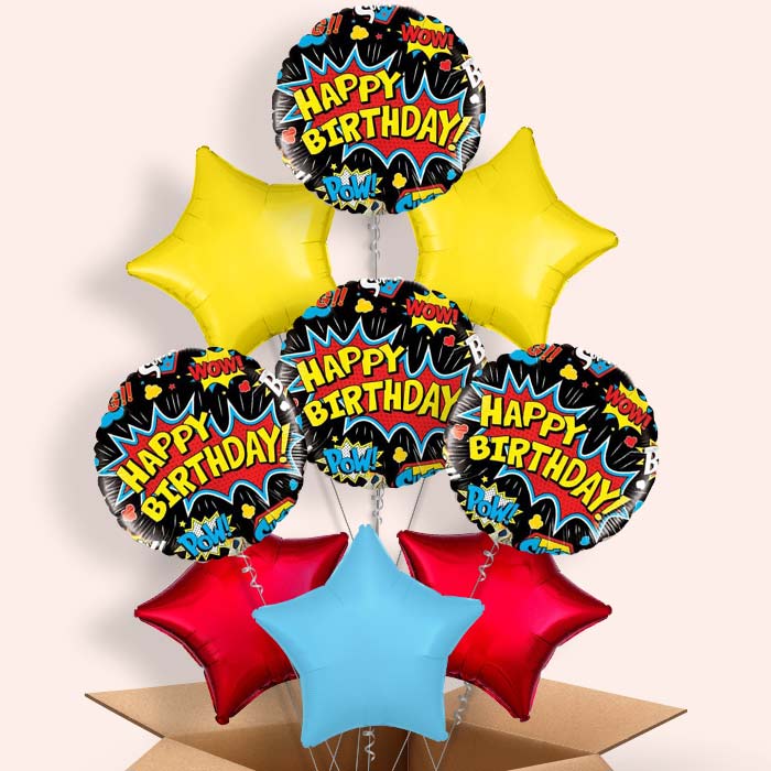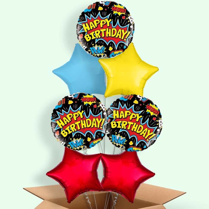 An epic Superhero Balloons in a Box (Black Pow) surprise featuring a Superhero inspired birthday message.