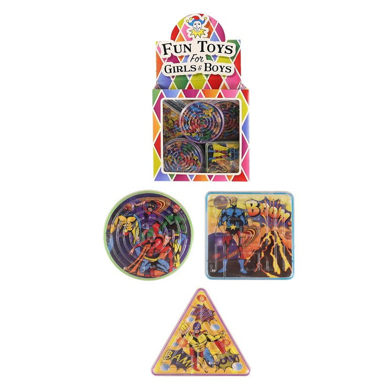 Superhero Maze Game Party Bag Filler Favour. Each maze features Superhero print.