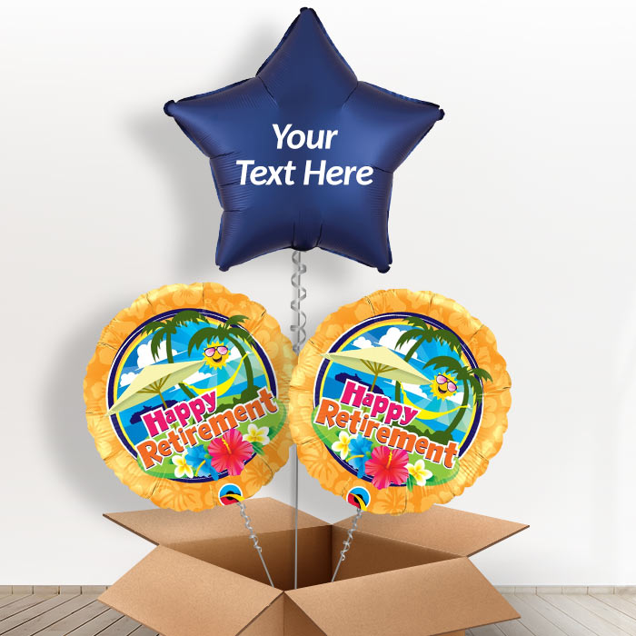 Personalisable Inflated Happy Retirement Tropical Beach 3 Balloon Bouquet in a Box Gift.