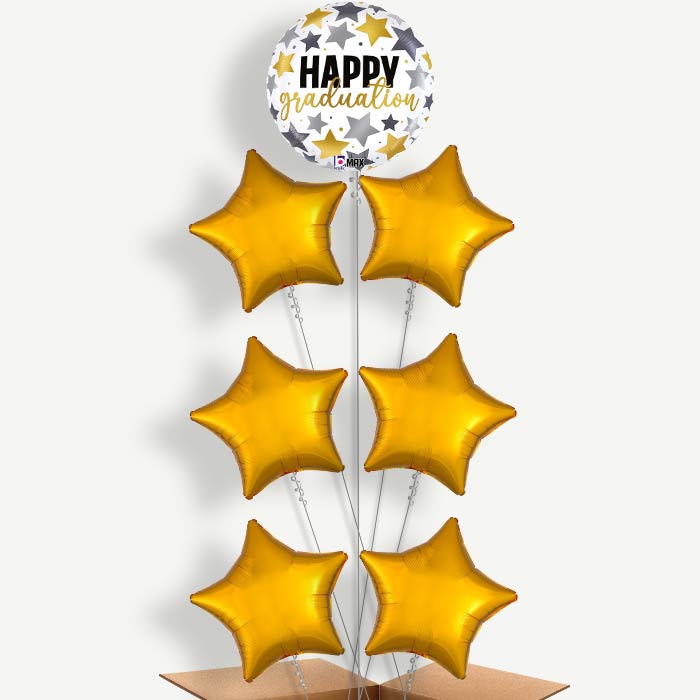 Celebrate in style with White Graduation Balloon Arrangement Inflated with Helium. This balloon arrangement has a featured design balloon on top with 6 plain coloured balloons underneath.